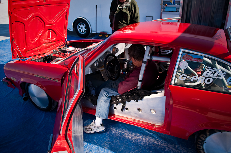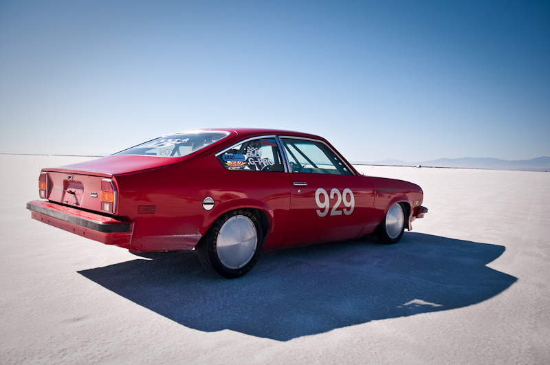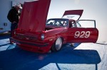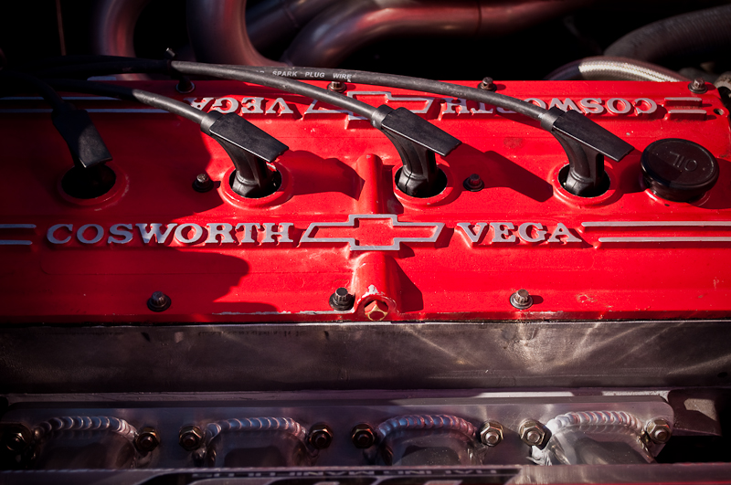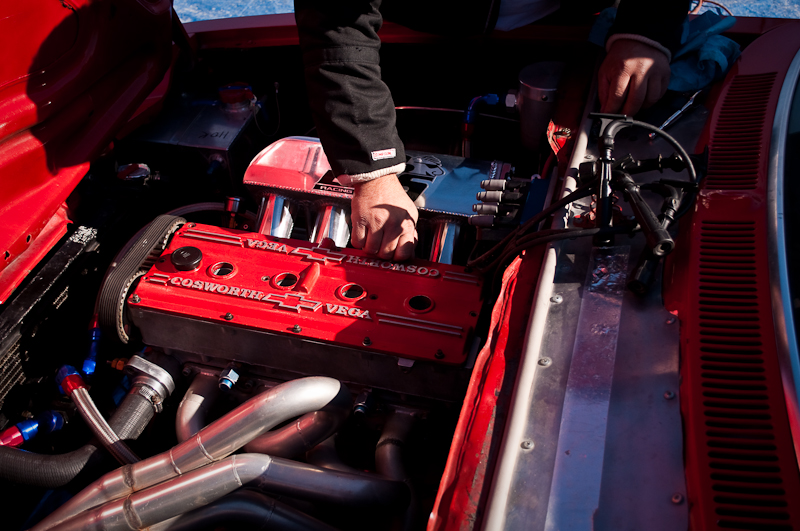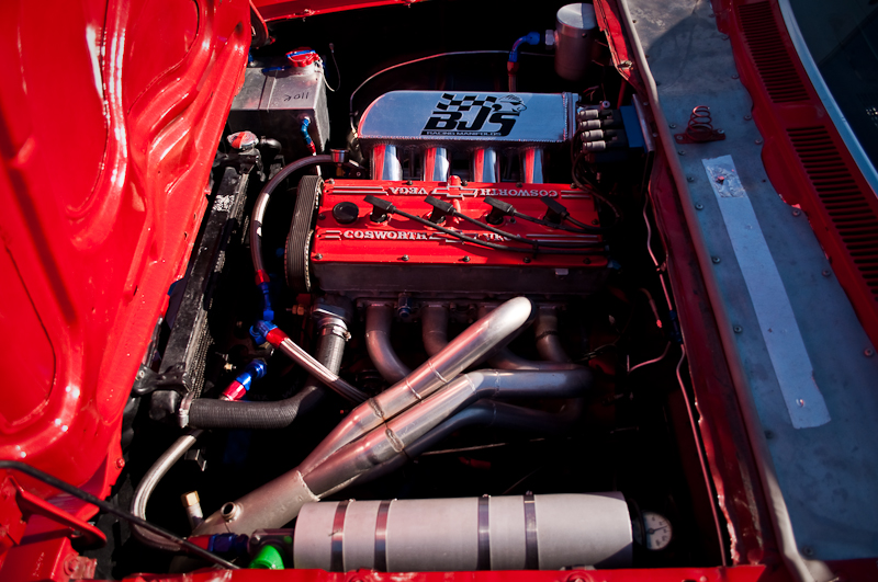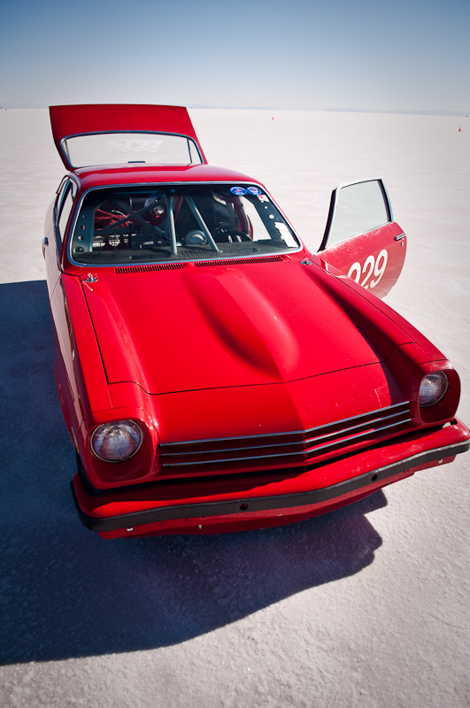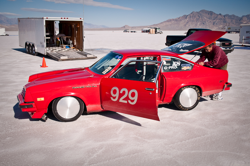 While at World Finals at Bonneville on Friday, I was cruisin’ the pits looking for cool cars. I spotted the little red Vega with its hood up and the small crew busy working. I walked over and just started watching and listening to the sweet Cosworth powered twin cam engine. I did not know anything about the rare Cosworth Vega (only about 3500 total built during 2 years of production), but I left with the interesting basics. The owner/driver Frank Sloan from California answered all my noobie questions and left me wanting more. Luckily, his “Cosworth Vega Owners Association” decal had a website that can give you the history of the Chevy. The concept actually started out as early as like 1970 or so. The Chevy Special Projects group (Chevy Racing Dept.) wanted a hot little econo-rod to compete with BMW’s 2002ti and Datsun’s 510. Original designs called for a 2.0L twin cam, 16 valve aluminum head and block built by the Indy car engine builder Cosworth to make around 185hp. After having smog certification test failures, the car was late to the market and only showing 110hp.