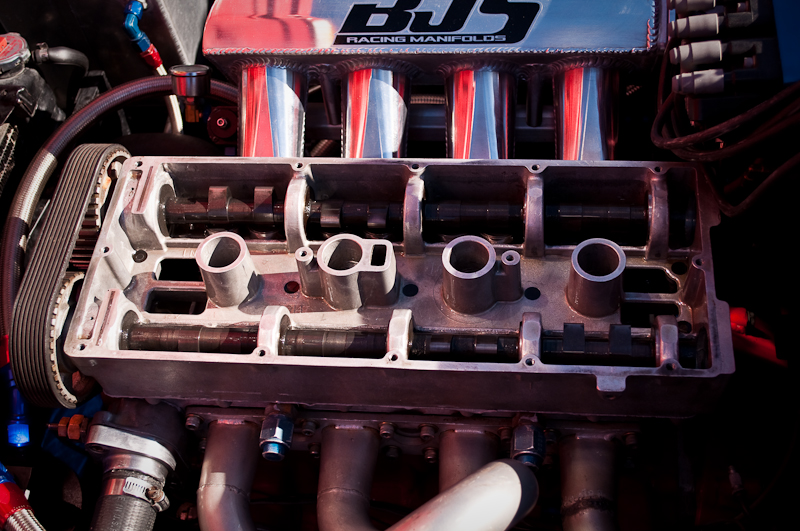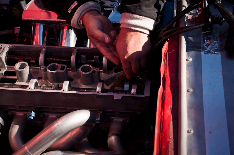 I tried to snap some interesting photos of Frank and his “crew chief” who I failed to get a name for. Sorry man! You can see in the pics below that his crew man is checking valve lash under the cam lobes with feeler guages, and removing and replacing the valve cover. It’s weird to see all the valvetrain (springs/retainers/followers) underneath the cams instead of on top like modern DOHC engines. Remember, this design is over 30 years old and with modern tuning, Frank and crew more than doubled its factory power rating. If I remember correctly, the factory top speed was 112 MPH. Frank has added about 44 MPH without touching aerodynamics, besides a lower ride height. He can only change gear, tire diameter, ride height, tranny and engine. Nice work!