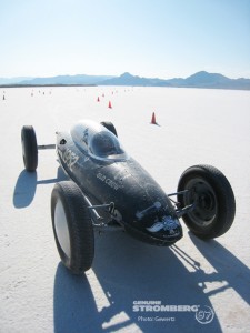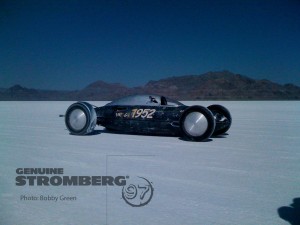 Stromberg Carburetor is proud to announce the first World Land Speed Record powered by New Stromberg 97 carburetors. Congratulations to Bobby Green and the Old Crow Speed Shop crew from Burbank, CA for shattering their 104mph 2008 V4/FS record with a new 127.270 mph pass at Bonneville’s Speed Week in August 2009 with their belly-tank lakester.