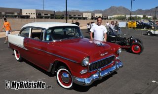 Rob's 1955 Chevy Gasser Hits the Goodguys Autocross As you know from the 1968 Shelby GT500-KR post I did, I love the autocross Goodguys puts on with their Arizona Spring Nationals Show in March. You can't beat AZ in March (see the folks wearing shorts in the pic below!) and you can't beat hot rods sliding sideways when they were built to be driven in a straight line. Case in point is Rob "thehazmatguy" and his 1955 Chevy Bel Air he just calls, "1955" in his personal garage here at MyRideisMe.com. Looking at the car, it doesn't take long to notice the nod to Gassers of old. (Every Hot Rod Gasser Story at MyRideisMe.com) The slightly nose-up stance, fenderwell headers and plenty of punch from the ZZ4 Chevy under the hood linked to the compulsory manual box changing gears, this time in the form of a TKO600. Nuff to say, this car's sweet. When I saw Rob in line to run the autocross, I had to watch and his girlfriend, Ryan Marie took this video to show how Rob drove it hard!! [youtube]http://www.youtube.com/watch?v=7R3RfMBL-fE[/youtube] . . But wait, there's more...