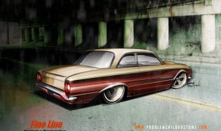 Custom Inspiration for your Ford Falcon Brian Stupski's got a custom eye for anything with wheels, and wouldn't ya know it? This time he turned his styled eye on one of our favorites, the Ford Falcon. I've got a 1963 Ford Falcon wagon I'm working on now. Maybe I can swing some of these custom tricks to apply to my Falcon. How about you? For more Falcon fun, check out my own project: 1963 Ford Falcon Wagon Build To have Problem Child Kustoms trick out your car, get in touch with Brian at ProblemChildKustoms.com Until then, drool over these great ideas for one trick Falcon! Stay tuned, we're trying to reach FineLine Kustom and Restoration in Onalaska, WI to get some periodic updates of the Falcon build. Yep! This car is under construction now. Here's a shot of the interior Brian did... your basic two-seater... Under the hood? Nothing special... check this out! Last, you need to see some renderings of the final car build. This is gonna be one amazing car! To get your dream car drawn, contact Problem Child Kustoms...