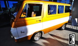 More Custom Vans at 2013 SEMA Show   I already mentioned the "Chrome Gypsy" custom For Econoline van, now it's time for a Dodge and Chevy custom van.   Has the SEMA Show changed their criteria? Are they letting just about anything in the show now? Or... are these some RAD, well done vans that make a clear statement: Custom Vans are back!     First up, a van named, "Van del Oro" and we'd have to agree... Van of GOLD! In the morning sun (unfortunately parked in the shadow of a huge column) this van was glowing. A quick peak inside said the beauty was more than skin deep.     With more gold, and I think a little more metal flake on the interior highlighted by a Mooneyes steering wheel, chrome dash and Moon pedal, there's a clear attention to detail. Upholstery was by Howdy Ledbetter Upholstery and looked clean, custom and comfortable.   Under the engine cover? How about a 380 HP 360 Dodge. Toy's by Tommy and owner ??? (help here) are keeping it in the Dodge family. Thank you for not dropping in a...
