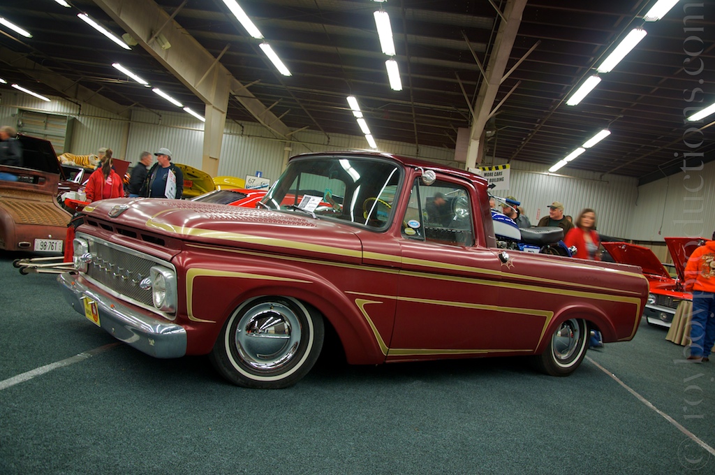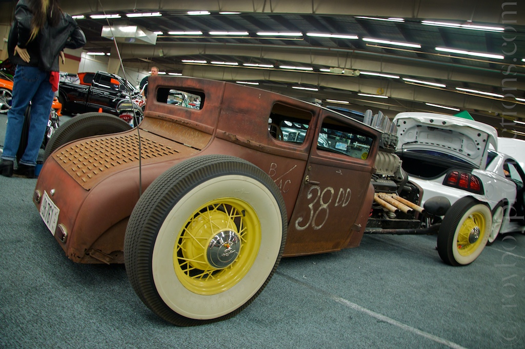 The caution was quickly replaced by a big smile when I ran into some old friends and some favorite, familiar rides. The McGregor Boy Hot Rod Shop had a killer display setup with the hoodless more-door Caddy, unibody Ford pickup, radical rat and some sick bikes. After geeking out over their twin engined Triumph drag bike, I made my way over to building #3.