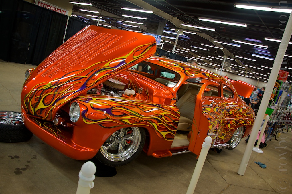 Open the door and BANG there’s a face full of funny cars, Connie Kalitta’s Bounty Hunter Mustang and Jungle Jim’s fliptop Camaro were beautifully detailed and just plain cool to check out. Around the corner and it’s Ron Pinkston’s jaw dropping flamed out Merc with the killer paint extending into the engine compartment, and under the car. Suicide doors, front flip hood, frenched headlight, perfect chop, this car has all of the cool tricks.
