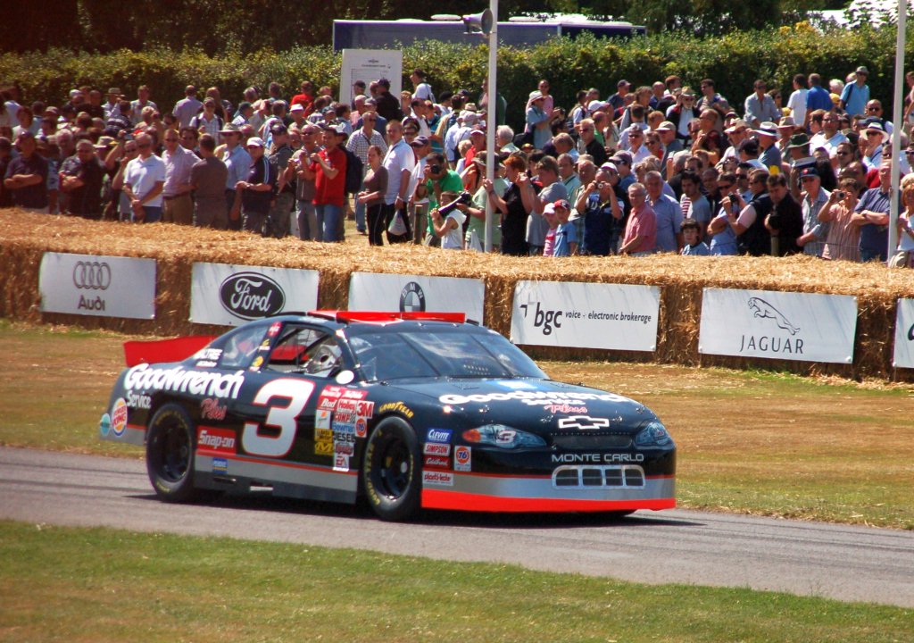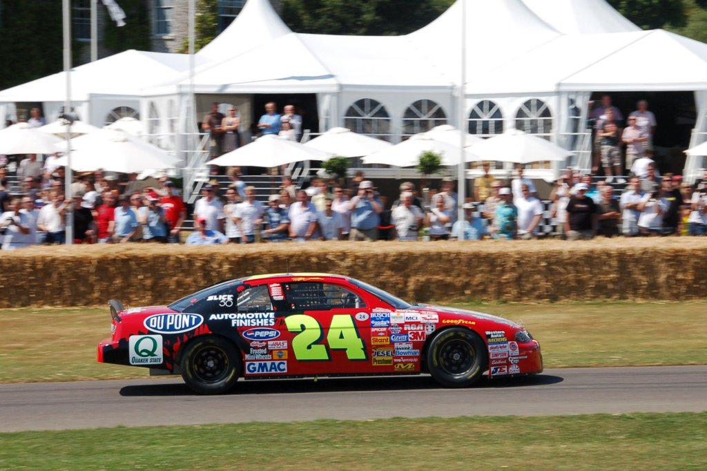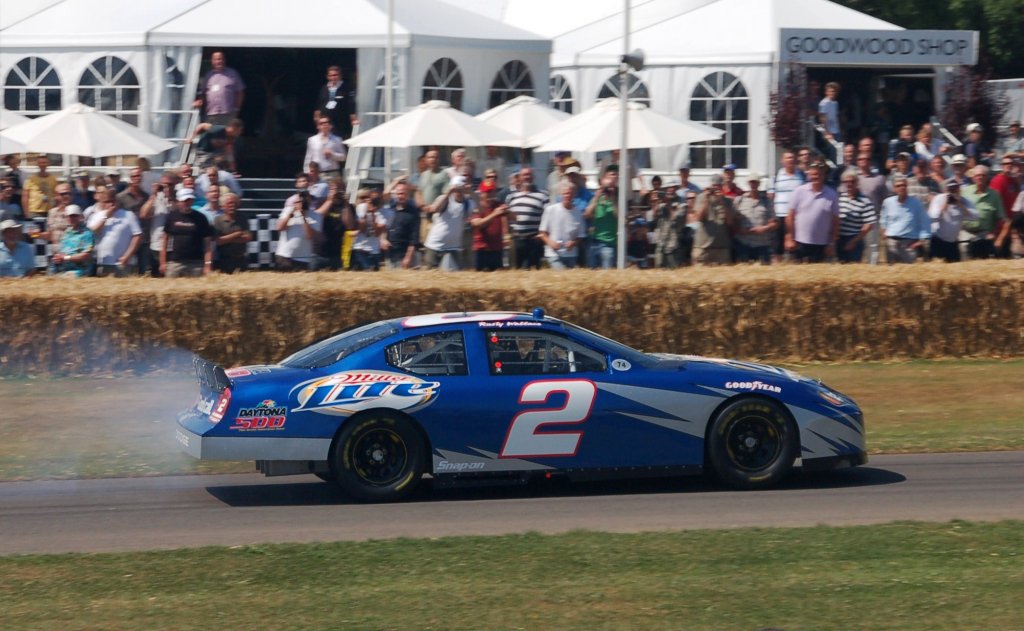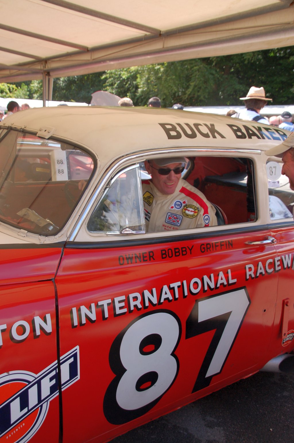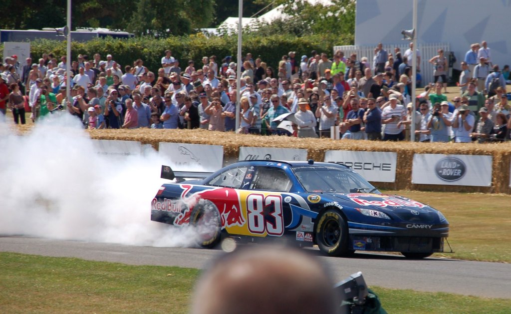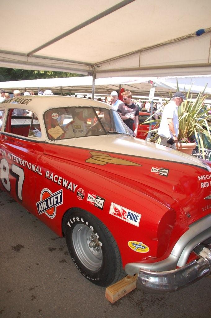 fore that) and so with British fans having never seen these cars in action, I was interested to check it out. About half a dozen cars had been shipped over and the star for me was a 1949 Oldsmobile Rocket reputed to be the oldest surviving NASCAR racer, in fact it actually precedes NASCAR itself having raced on Daytona Beach before the NASCAR series was conceived. We were looking forward to seeing these cars make the traditional run up the hill past the grandstands and Goodwood House and the driver of the ’09 Red Bull Toyota Camry didn’t disappoint with a full smoky burnout up the first straight, the smoke fully engulfing the tables and umbrella’s of the V.I.P. area. The sound of these big V8’s on full song was loud enough to deserve the description ‘awesome’ and made us want to experience a full starting grid at a proper event sometime, one for the Bucket List methinks….
